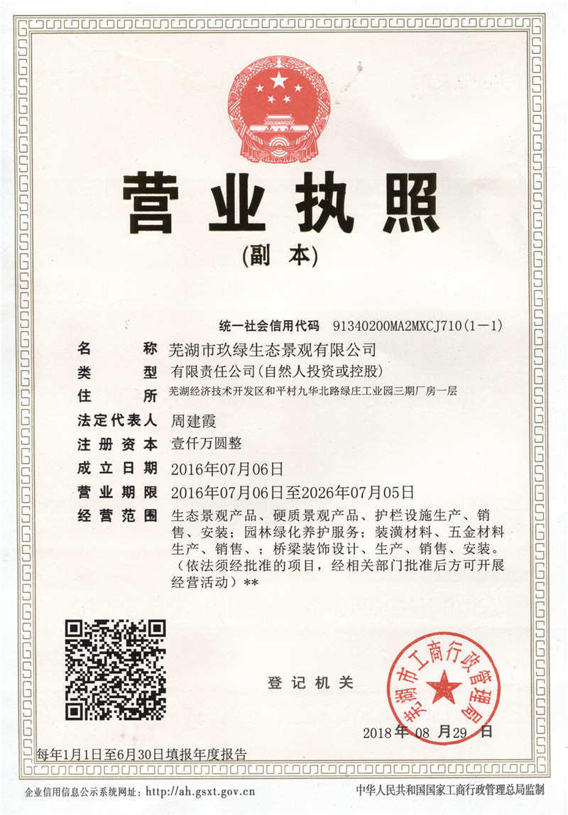 蕪湖市玖綠生態景觀有限公司成立于2016年,是綠莊集團蕪湖市綠莊工業技術有限責任公司的獨立子公司,公司位于蕪湖市國家級經濟技術開發區內,主營硬質景觀產品的生產、制造、銷售及工程施工和相關資訊服務。服務涵蓋水利景觀、交通設施、園林設計、園林資材、裝飾工程等,其仿木仿石欄桿及其仿木樁等產品及服務遠銷中國21個省2個自治區3個直轄市系該細分行業國內規模較大,技術水平先進的整體解決方案服務商……